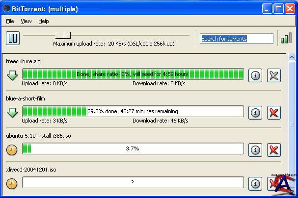 Описание: фициальная клиентская программа пиринговой сети BitTorent, нацеленной на возможность загрузки файлов большого размера. В отличие от других подобных сетей (Kazaa, eDonkey и т.п.), где владельцами одного и того же файла могут быть сразу несколько человек, у которых этот файл находится, BitTorrent предусматривает наличие у файла единственного владельца, который и заинтересован в его распространении. Кроме этого, особенностью этой сети является очень высокая скорость скачки файла, что достигается за счет оригинального способа его выдачи файла сразу с нескольких компьютеров даже в том случае, когда целиком файла на них еще нет. У этой программы есть и минусы, самый главный из которых заключен в том, что никакой системы поиска файлов не предусмотрено - загрузка начинается после щелчка по так называемому torrent-файлу, который можно найти на специальных сайтах Сайт программы: www.bittorrent.com/ Статус программы: Бесплатно Интерфейс: Английский Версия: 6.4 | сообщить о новой версии Размер файла: 2886 кб Системные требования * Windows NT/2000, XP, 2003, Vista, 7, Wine * 32-bit and 64-bit editions of Windows supported