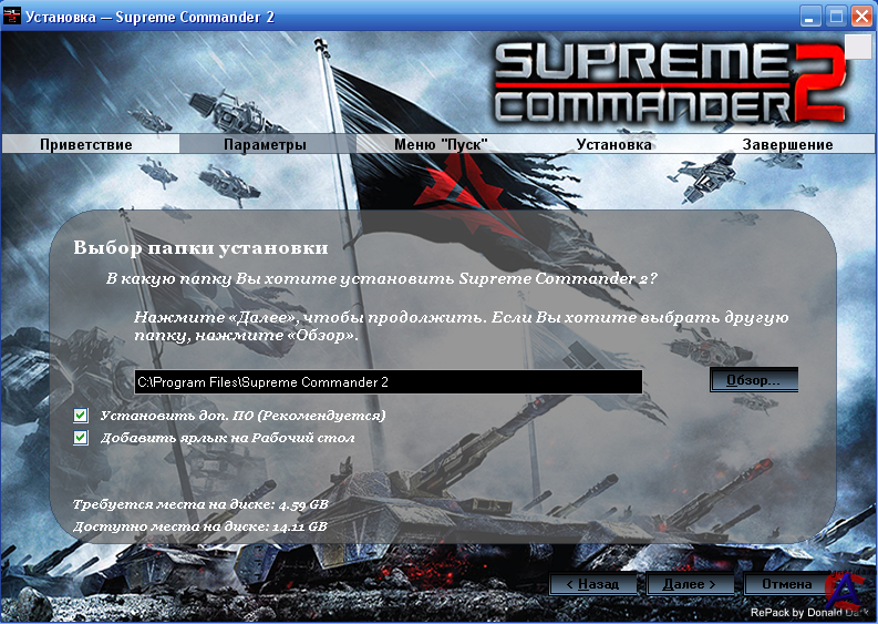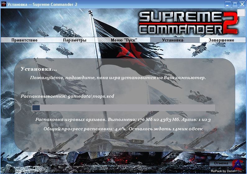 Supreme Commander 2 (ENG/RUS) {Strategy|2010} [RePack] Год выпуска: 2010 Жанр: Strategy (Real-time) / 3D Разработчик: Gas Powered Games Издатель: Square Enix Тип издания: RePack Язык интерфейса: русский Язык озвучки: английский Таблетка: не требуется Системные требования: * Операционная система: Windows XP SP3/Vista SP1/Windows 7 * Процессор: AMD Athlon 64 3800+, 2,4 ГГц/Intel Pentium IV 530, 3,0 ГГц * Оперативная память: 1 Гб * Видеокарта: NVIDIA 7800GT/ATI Radeon X1900 с 256 Мб * Свободное место на жестком диске: 5 Гб Особенности игры: • Освойте оружие далекого будущего • Сражайтесь в воздухе, на суше и на море • Сетевая игра – двадцать уникальных карт, до восьми игроков одновременно Описание: Добрый день, космические пехотинцы! Вот и настало время новой войны. 25 лет мы держали хрупкий мир, но в тайне готовились к войне... И она наступила!. Пусть враги попробуют на вкус заряды наших новых орудий, пусть трепещут от вида новейших боевых роботов!. Помните - роль пехоты на поле боя также велика, как и ранее. Крушите врага, уничтожайте его войска и защитные купола - нам нужны новые территории и вражеские ресурсы!. В этой войне победит только одна сторона - и нею должна быть именно наша нация! Держитесь крепче, закаленные командиры космодесанта. Готовьтесь, стратеги грядущих войн. Вас ждет новое сражение, равных которому еще не было. Эта война изменит ваше представление о битвах далекого будущего. Возглавьте бесчисленные армады одной из трех уникальных фракций – в самой глобальной и масштабной стратегии последнего времени!Великолепная стратегическая игра "Supreme Commander 2" предстанет перед игроками в новой графике, с новейшими юнитами, массой изменений в тактике ведения боя, но оставлен глобальность сражений, невиданная армада техники и все тот же невероятный геймплей!