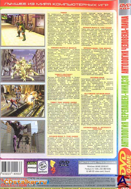 Платформа: PC Тип издания: пиратка Язык интерфейса: русский Язык озвучки: английский (в spider-man 2: activity center русский) Таблетка: не требуется Тип: СБОРНИК Описание: ИГРЫ ПРО ЧЕРЕПАШЕК-НИНДЗЯ 1)TMNT (teenage mutant ninja turtles) Первая игра из серии про черепашек-ниндзя. Портирована с PS1 2)TMNT 2: Battle nexus Одна из самых удачных игр про черепашек. Множество разных режимов игры и интересный синглплеер. Советую. 3)TMNT 3: Mutant nighmare В основном эта игра завязана для кооперативных баталий, где сражаются все те, кто каким-то образом связан с миром черепашек ниндзя. Можно играть в ЧЕТВЕРОМ (!) на одном компьютере. ИГРЫ ПРО ЧЕЛОВЕКА-ПАУКА 1)Spider-man 3: the game Добротная игра по фильму. выполнена в среднем качестве, для любителя. 2)Spider-man 2: the game По моему, самая удачная игра в 2004 году про паука. 3)Spider-man: movie Эта игра портитирована с Dreamcast. Аркада чистой крови. 4) Ultimate spider-man Вот что получится, если совместить GTA и Spider-men"a. 5)Spider-man 2: activity center Детский набор мини-игр про паука. Системные требования: Windows XP и более новые, Pentium IV 1500, 256 MB RAM, 32 MB 3D. Изменил название TMNT на черепашки-ниндзя для упрошенного поиска