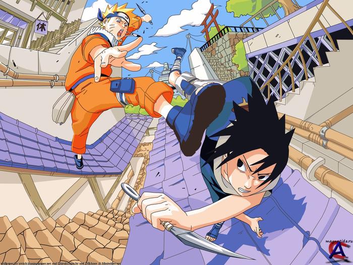 Взято с kinopoisk.ru Мир Основная статья: Мир Наруто Действие всей серии «Наруто» разворачивается в вымышленном мире, социально-политической структурой напоминающем феодальную Японию. Небольшие по размеру государства в нём действуют и развиваются как самостоятельные единицы, управляемые феодалами-даймё. Государства имеют в своём распоряжении скрытые деревни (яп. ЊМ какурэдзато?), поселения ниндзя, во главе которых стоит независимый правитель — кагэ. Ниндзя используются в качестве военной силы, а также участвуют в экономической жизни государства, выполняя оплачиваемые миссии — от прополки огородов до вылазок на вражескую территорию. Уровень развития технологий в мире «Наруто» весьма противоречив: с одной стороны, в распоряжении героев имеются современные камеры наблюдения и передатчики, с другой — прогресс практически не затрагивает военную сферу, где полностью отсутствует огнестрельное оружие и боевые машины, намеренно исключённые автором из повествования[6]. В отсутствие достижений военной промышленности персонажи полагаются на сюрикены, кунаи, мечи и собственные специальные способности, которые включают использование чакры — магической энергии[7], равнозначной энергии ци, и жестов для её контроля — печатей. Использование чакры подчиняется строгим правилам, которые Кисимото ввёл для того, чтобы иметь возможность легко объяснять повороты сюжета[6]. Автор высказывал опасения, что чакра и складывание печатей, основанных на заимствованных из Китая знаках зодиака (англ.), делают мангу «слишком японской», однако сам он доволен ею[8]. Сюжет Главный герой серии, подросток Наруто Удзумаки, является носителем девятихвостого демона-лиса, запечатанного в его теле. За двенадцать лет до начала событий, излагаемых в манге, демон-лис напал на деревню Скрытой Листвы (яп. (ОI ЊnМ Конохагакурэ но сато?, или просто Коноха[9]), родную деревню Наруто. Ради спасения Конохи четвёртый хокагэ, глава селения, пожертвовал жизнью, чтобы запечатать дух зверя внутри своего новорождённого сына Наруто. Хокагэ желал, чтобы люди считали Наруто героем, поскольку отныне он сдерживал мощь девятихвостого лиса, однако население деревни восприняло Наруто как демона во плоти и возненавидело его. Поскольку упоминать об атаке лиса было запрещено, Наруто узнал о своей необычности лишь случайно, годы спустя. Главные герои — Сакура Харуно, Наруто Удзумаки и Саскэ Утиха — со своими учителями Какаси Хатакэ и Ирукой Умино. Манга делится на две части. В начале первой части Наруто с большим трудом завершает обучение и получает звание гэнина — начинающего ниндзя. Он и двое его одноклассников, Саскэ Утиха и Сакура Харуно, образуют команду под началом опытного сэнсэя Какаси Хатакэ. По мере развития сюжета Наруто находит новых друзей среди жителей деревни и овладевает новыми способностями, считая их необходимыми для того, чтобы в будущем исполнить свою мечту — стать хокагэ. Вскоре Коноха подвергается атаке: беглый ниндзя и разыскиваемый преступник Оротимару вместе со своими приспешниками нападает на селение, убивая его главу — третьего хокагэ. Будучи в состоянии меняться телами с другими людьми, Оротимару желает заполучить тело Саскэ Утихи, считая его наследственные способности подходящими для себя, так как Саскэ является представителем клана Утиха, наиболее одарён