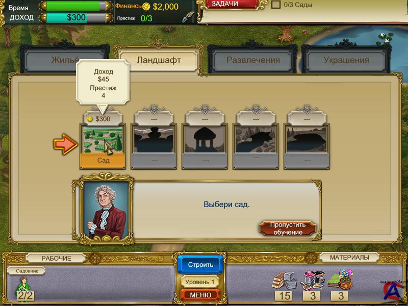 Платформа: PC Язык интерфейса: Русский Язык озвучки: любительский перевод Описание: Франция, восемнадцатый век. Вы - молодой неизвестный архитектор, мечтающий о шансе произвести впечатление на королеву. В этой игре, симуляторе строительства, в романтическом мире французской аристократии Вам предстоит разрабатывать дизайн и управлять строительством самый красивых зданий страны. Привлечёт ли Ваша работа внимание королевы, суждены ли Вам слава и богатство или Вы так и останетесь неизвестным архитектором? В игре 40 уровней, 44 вида строений в 4-х категориях, 15 типов материалов для строительства и много всего интересного. Почувствуйте себя настоящим дизайнером! Системные требования: Windows XP/Vista 1.2 GHz or faster processor 1024 MB RAM 122 MB hard disk space DirectX 8.0 or higher Доп. информация: Любительский перевод Aldana при участии LeRKo