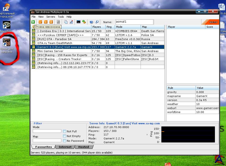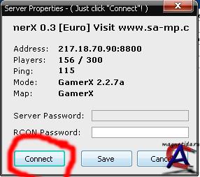 - Grand Theft Auto: San Andreas - одна из популярнийших игр, думаю все играли в синглплеер (одиночную игру) - Возможность поиграть с друзьями, посидеть с ними "в одной машине" - Разнообразие игровых режимов: от гонок до "симуляторов реальной жизни" Системные требования:: Процессор: Pentium 4 2400 MHz и выше; Память: 512 MB и выше; Видеокарта: DirectX 9.0c - совместимая с 128 MB памяти; Система: Widows 2000/ME/XP; Звуковая карта (Без нее не запустите игру!); Нам нужно: - GTA:San Andreas ( обычная, без модов патчей и т.д. (иначе игра будет глючить и вы не сможете полноценно поиграть) - Клиент (программа для игры по сети) Инструкция по установке клиента: - Для начала установите на свой компьютер чистую версию игры GTA SAN ANDREAS. Напоминаю,что не должно быть установлено никаких модификаций, машин, оружия, скинов, спидометра и др. - Запускаем rus1.exe и rus2.exe - Затем запускаем sa-mp-0.3a-install.exe, далее следуем инструкции - После того как вы установили клиент нажимаем Add Server(оранжевая галочка) и вводим ip-адрес сервера, жмём Connect (Зёленый треугольник) - На всех серверах sa-mp (San Andreas Multiplayer) можно выбрать себе персонажа (листайте клавишами вправо и влево) когда выбрали, нажмите Shift Управление: G- подсесть пассажиром F6- чат Caps Lock - стрелять из окна машины ВНИМАНИЕ!!!! Для запуска игры по сети нужно нажимать не на стандартный значок, а на значок под названием samp.exe!!!
