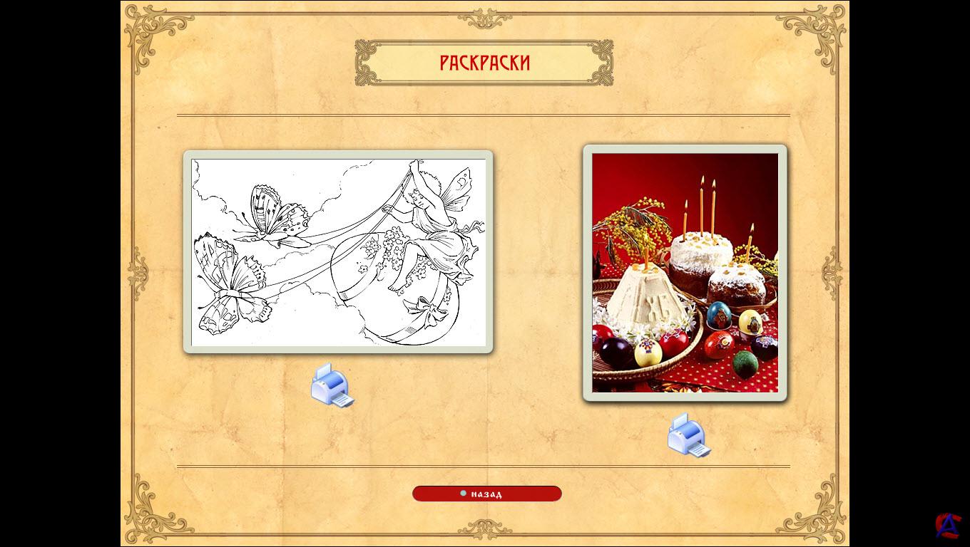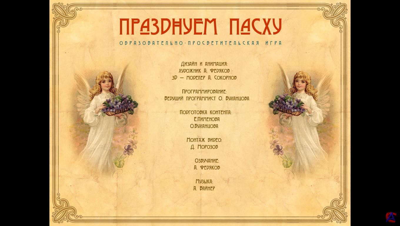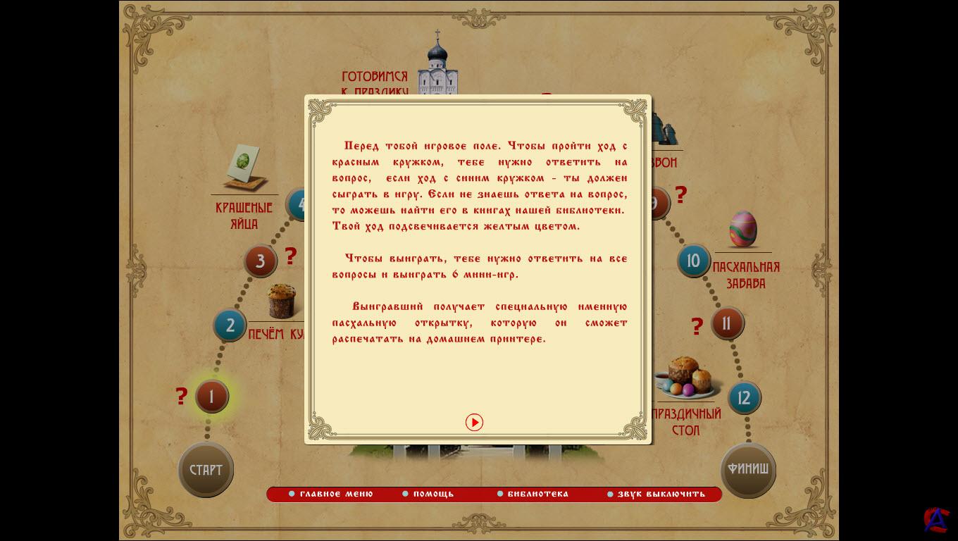 Минимальные системные требования: Операционная система: Windows 98/ME/NT/2000/XP/7 Процессор: Pentium III 600 MГц Память: 64 МБ Видеокарта: 16 МБ, DirectX 9.0 Аудиокарта: Совместимая с DirectX 9.0 Свободное место на ЖД: 180 МБ Размер: 112.13 МБ (117,576,767 байт) ЭКСКЛЮЗИВНО от Nevosoft Приближается праздник Пасха, который, мы убеждены, празднует подавляющее большинство наших игроков. И специально к этому празднику мы представляем вам детскую игру "Празднуем Пасху", поиграв в которую, вы узнаете много нового об этом светлом празднике, о его истории и традициях празднования. Игра состоит из трех частей: игровая часть, библиотека и бонус. Игра "Празднуем Пасху" похожа на настольную игру с кубиком. На игровом поле нарисован путь в виде кружочков, который должен пройти игрок, чтобы выиграть игру. В процессе игры нужно отвечать на вопросы, посвященные истории праздника Пасхи. Вся необходимая информация находится в разделе «Библиотека». Чтобы пройти всю игру, нужно ответить на вопросы и выиграть в мини-играх. Выигравший получает специальную именную пасхальную открытку, которую он сможет распечатать на домашнем принтере. В разделе «Бонус» можно распечатать пасхальные открытки и раскрасить их самостоятельно. Игра снабжена красочными изображениями, иллюстрирующими традиции Православной Церкви.