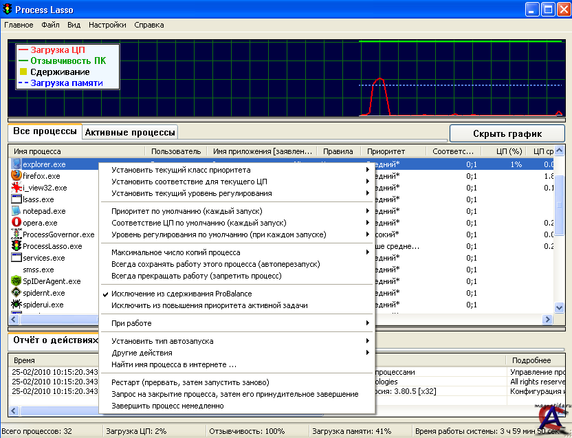 Версия:3.84.0   Язык интерфейса:Русский     Программа, позволяющая вручную или автоматически манипулировать процессами, запущенными на вашем компьютере для достижения максимального быстродействия и стабильности. Эта утилита не является заменой стандартному менеджеру процессов, она, скорее, добавляет новые функции, которые позволяют оптимизировать работу ЦПУ при максимальной нагрузке. Программа дает возможность определить приоритет процессов, причем, по желанию пользователя приоритет будет задан и для всех последующих запусков. Также при помощи этой утилиты можно выполнить завершение работы нежелательных процессов. Кроме этого, программа позволяет вести статистику запущенных процессов.