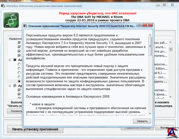 Название Программы: The DNA Soft 7.1 Версия программы: 7.1 Последняя Версия программы: 7.1 Адрес официального сайта: dna.ucoz.org Язык интерфейса: Русский Платформа: Windows 7 x86 (32bit) и x64 (64bit), Windows Vista x86 (32bit) и x64 (64bit) Лечение: не требуется Тип лекарства: не требуется Системные требования: Процессор 1 ГГц и выше 32-разрядный (x86) или 64-разрядный (x64) процессор Видеокарта DirectX 9 графики с WDDM 1.0 или более поздней версии драйверов Память 1 Гб оперативной памяти Жесткий диск 16 Гб свободного дискового пространства Описание: Описание: The DNA Soft — это собрание программ. Не совсем обычное, к каким привыкло большинство пользователей ПК. Это собрание будет чрезвычайно полезно как новичкам, впервые оказавшимся за клавиатурой и мышью, так и маститым профессионалам, системным администраторам. Ключевая особенность - автоматическая установка программ, выбранных пользователем. Будет очень удобно при развертывании комплекса приложений на большом количестве ПК, при создании необходимого для работы программного окружения после переустановки ОС. Нет необходимости повторять однотипные операции сотни раз, что существенно экономит ваше время и силы. Состав сборки: