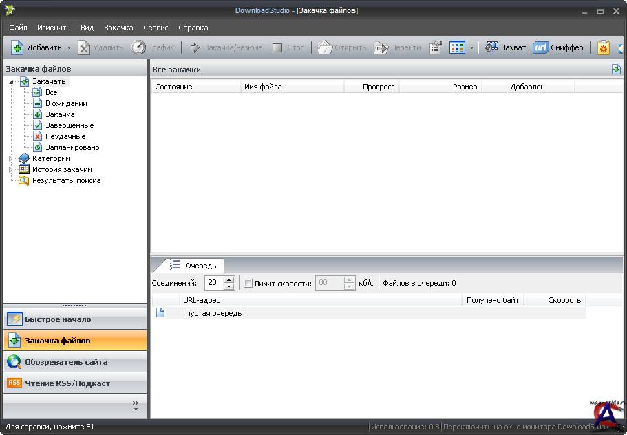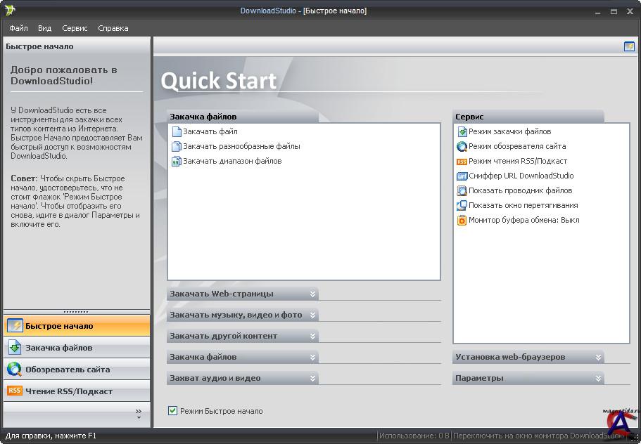 Основные функции: - Загрузка файлов. - Выставление ранга файлов по приоритету загрузки. - Полная загрузка веб-сайтов. - Загрузка RSS лент. - Проверка URL адресов. - Обнаружение и загрузка Flash-роликов. - Обозреватель веб-сайтов. Новые функции и возможности в DownloadStudio 6.0.3.0: - Новинка! На 30-50 % быстрее алгоритм загрузки. DownloadStudio был протестирован со всеми популярными качалками, и DownloadStudio был самым быстрым менеджером загрузок, загружая 1 МБ, 10 МБ, 100 МБ и файлы на 4 Гб из веб-сайтов, расположенных во всем мире. - Новинка! Загрузка видео высокой четкости (HD) из Youtube, Metacafe и других. - Новинка! Действия пост-обработки после закачки. Автоматическое объединение составных файлов (.001.002, и т.д.), автоматическая распаковка сжатых файлов. - Новинка! Автоматическое преобразование аудио/видео. Преобразование загруженных аудио и видео файлов в выбранном формате. Например, с YouTube конвертировать Flash Video (FLV) в MPEG-2, AVI, M4V или WMV. - Новинка! Поддержка медиасервера Mezzmo DLNA- загружает фильм и добавляет автоматически к Mezzmo, так что это может быть передано используя DLNA к телевизору! - Новинка! Установка прокси-серверов для определенных веб-сайтов для загрузки заданного. Добавьте в настройки прокси-сервера свои правила сайта или загрузку, так что вы можете скачать, используя разные прокси-серверы в зависимости от сайта или URL. - Новинка! Счетчик байт - все загруженные байты теперь учитываются и выводятся на экран в строке состояния. Сбрасываться счетчик будет каждый месяц. - Улучшено! Поддержка последних веб-браузеров - Internet Explorer, Firefox, Chrome, Opera, Safari и других. - Исправлено! Более 50 исправлений внесено в данную версию, о которых сообщили нам пользователи.
