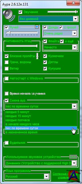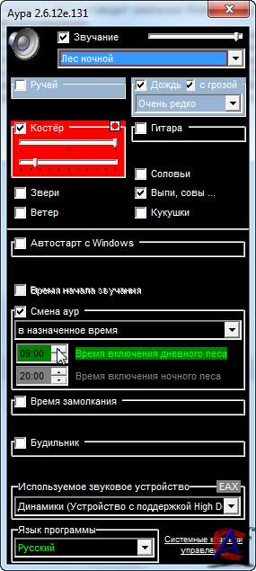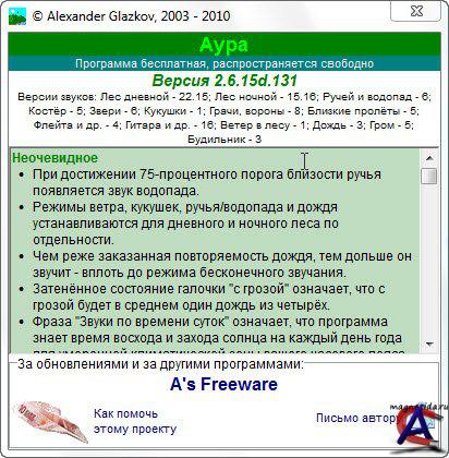 Название: Аура Назначение: релаксация Разработчик: www.umopit.ru/ Год: 2010 Платформа: PC Версия: 2.6.12е.131 + обновление до 2.6.15d.131 Язык интерфейса: многоязычный, русский имеется. Таблетка: не требуется Системные требования: компьютер,колонки, Windows 98/Me/2000/XP/2003/Vista/2008/Seven Описание: Программа показывает свой значок рядом с системными часами и воспроизводит реальные божественные звуки девственного леса. Достаточно одного щелчка по значку чтобы выключить или включить воспроизведение. Щелчком правой кнопки «мыши» вызывается пульт управления. Здесь можно задать автоматический старт программы при включении компьютера. Можно указать, должна ли при автостарте программа сразу звучать, или она должна ждать Вашей команды. Можно отрегулировать активность птиц, кузнечиков, ручья, водопада, дождя, грома, костра, ветра, зверей, флейты, гитары, гармошки... Можно назначить автоматическую смену аур с заданной периодичностью или в конкретное время, или в соответствии со временем суток. Можно назначить автоматическое замолкание или тихое выключение компьютера в заданное время (для любителей засыпать под звуки природы). Можно назначить время начала звучания (для любителей просыпаться под звуки природы). Можно назначить время срабатывания и звук будильника. Можно назначить системные клавиши управления программой. Имеется встроенное Интернет-обновление. * версия 2.6.15d.xxx - добавлена возможность автостарта программы со звуками, соответствующими установленным временам смены аур; устранена привнесённая ошибка установки состояния активности галочки "Начало звучания", устранены ошибки режима смены аур с заданной периодичностью. * версия 2.6.14.xxx - пульт управления стал компактней; добавлен испанский язык; устранены ошибки в установках программы при переключении аур не из пульта; программа стала при старте сразу включать правильную ауру, соответствующую заданным настройкам. * версия 2.6.12e.131 - обновлены звуки гитары в ночном лесу; обеспечена поддержка японского языка, музыкальные инструменты перестали слишком уж отдаляться. * версия 2.6.12.130 - подправлен и оптимизирован алгоритм переключения аур, улучшена установка на Windows 7, почти полностью заменены голоса птиц дневного леса, пополнены грачи и вороны, обновлены фоновые звуки и голоса птиц ночного леса.