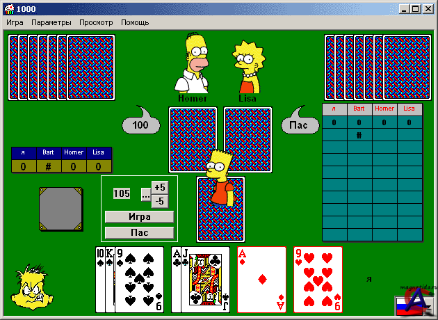 Популярная карточная игра - 1000. Партнерами по игре у вас будут персонажи популярного мультфильма Гоммер, Барт и Лиза. Цель игры - набрать 1000 очков. Всего в колоде 120 очков. Еще дополнительные очки дают марьяжи - сочетание короля и дамы одной масти. Червовый марьяж дает 100 очков за объявление (перед этим необходимо взять хотя бы одну взятку, а затем ходится с короля или дамы, после этого данная масть становится козырем), бубновый - 80, крестовый - 60, пиковый - 40 очков. Если вы не набрали сумму, которую заказывали, то эта сумма вычитается из ваших очков. Не стоит забывать, что десятка главнее короля и стоит 10 очков! Если даже не вы заказали игру, вы можете набирать очки на взятках. Хорошей вам игры! Игра не предусмотрена для нескольких игроков на одном компьюторе Системные требования: Тут и писать нечего, идёт даже на Windows-95