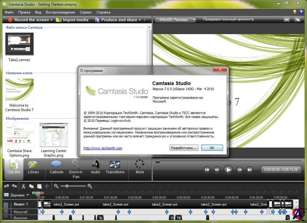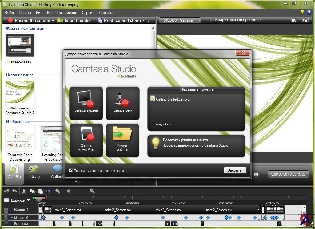 Описание программы: • Camtasia Studio - мощная утилита для записи изображения с экрана в видеофайлы различных форматов, имеется возможность редактирования видео, есть встроенные Macromedia Flash (SWF) и видео проигрыватели. Camtasia захватывает действия и звуки в любой части Windows-систем и сохраняет в файл стандарта AVI. • Сделанное при помощи программы видео можно экспортировать в один из поддерживаемых программой форматов - AVI, SWF, FLV, MOV, WMV, RM, GIF, CAMV. Кроме того, на основе любого видео может быть скомпилирован исполнительный exe-файл, который будет содержать встроенный проигрыватель. Camtasia Studio позволяет накладывать ряд эффектов, умеет работать с отдельными кадрами, облегчает запись, редактирование и публикование высокоточного, сжатого видео для тренировки, образования, дистанционного обучения, решений технической поддержки, демонстраций продукта, торговых презентаций и т.д. • Для сжатия видео разработчики Camtasia Studio предлагают пользователям использовать свой "фирменный" кодек TechSmith Screen Capture Codec (TSCC). Этот кодек показывает хорошие результаты при кодировании изображения на любой глубине цветности. Его алгоритм минимально нагружает систему, поэтому кодек может использоваться для кодирования даже на очень слабых конфигурациях. • Camtasia Studio включает в себя четыре утилиты: Camtasia MenuMaker, Camtasia Player, Camtasia Theater и Camtasia Recorder. Для работы со всеми этими утилитами служит главный интерфейс программы. • Сфера применения Camtasia Studio может быть самой разной. По заявлению разработчиков, программа может пригодиться, как минимум, в пятидесяти разных ситуациях. Ее можно использовать для создания интерактивных файлов справки, демонстрации новых возможностей программ, для записи демонстрационных роликов приложений и компьютерных игр и т.д.