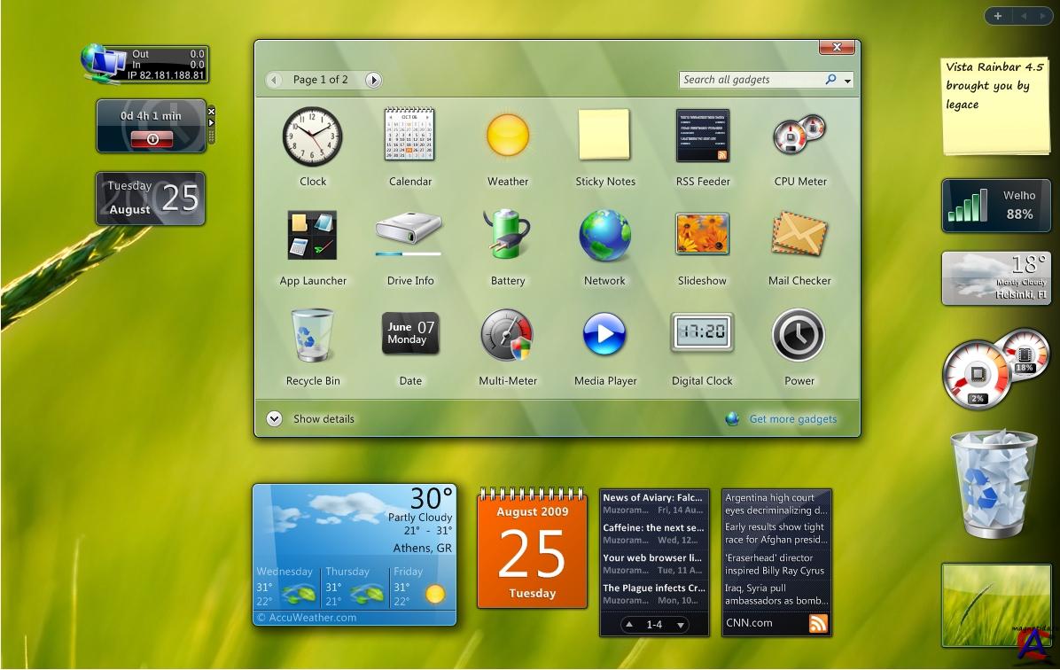 Версия: 4.6.0.0 Активация: Не Требуеться Язык интерфейса: Русский Описание: Vista Rainbar - это боковая панель для Windows XP/Vista, с набором всевозможных гаджетов, например: часы, календарь, RSS-ленты, погода и т.д. с возможностью настройки параметров и скинов. Появилась возможно разместить на рабочем столе строку поиска в Google, Yahoo и в других поисковых системах, панель управления Windows Media Player, принятые RSS каналы и полученную информацию о погоде, Календарь, часы и много разных расширений, отображающих сведения об активности компьютера. Доп. информация: Можно вывести данные входящего/исходящего трафика, об активности жесткого диска, загрузки процессора и оперативной памяти, а также отобразить текущее время работы компьютера. Программа поддерживает визуальные оболочки (скины), причем, не только для главной панели, но и для отдельных её элементов (часы, календарь). По утверждению разработчиков, их боковая панель, по сравнению с аналогичной панелью ОС Vista, занимает на 50 процентов меньше оперативной памяти. Системные требования: Платформа: Windows XP Системные требования: Pentium IV 1800 MHz 512 mb RAM