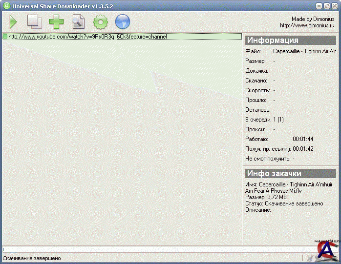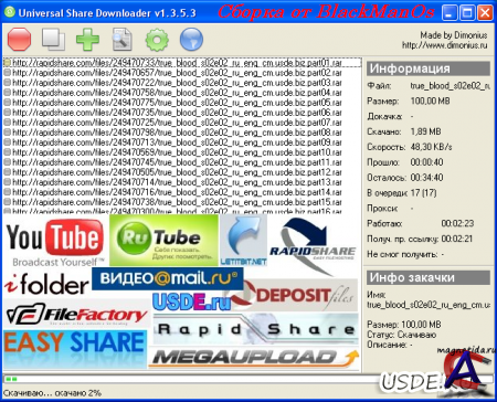Версия: 1.3.5.3 Активация: Не требуется Язык интерфейса: Русский Описание: Программа для скачивания файлов. В первую очередь оптимизирована под скачивание (в том числе полностью автоматическое) с различных файлообменных серверов типа rаpidshаrе.cоm, megаuplоad.cоm и прочих, сайтов с видео YouTube.com, RuTube.com и прочих. Вам достаточно добавить в программу ссылки, нажать старт и она скачает все самостоятельно. Вам уже не надо будет помнить через сколько времени снова можно скачать с рапидшары, сколько еще ссылок осталось и в какие папки все это сохранять. Системные требования: Windows XP, Vista, 7