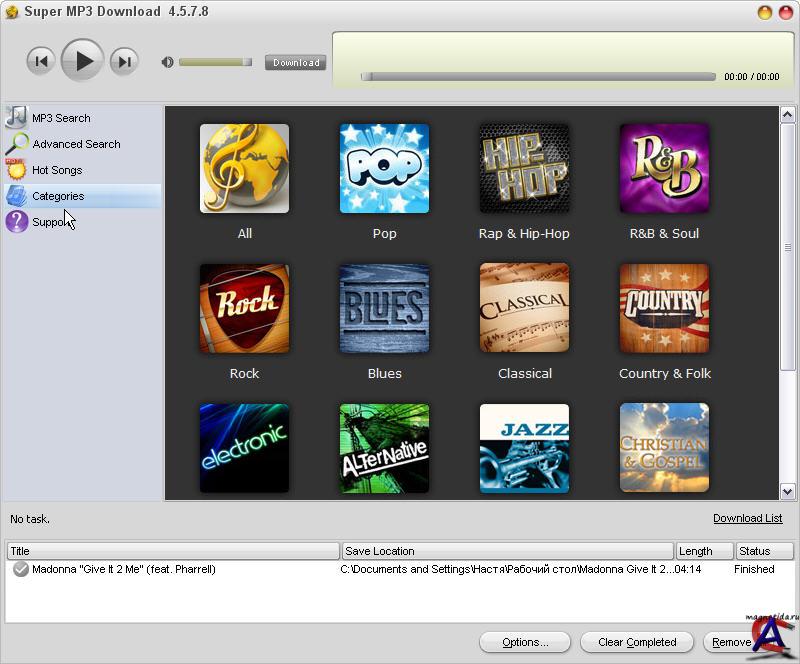 Версия: Super MP3 Download Pro 4.5.7.8 (2010) Установка: 1.Запускаем SuperMp3Download-4.5.7.8.Setup,устанавливаем,не запускаем 2.Запускаем super.mp3.download.4.5.xxx-patch,патчим Язык интерфейса: Английский Описание: Super MP3 Download Pro - программа, предоставляющая прямой доступ к бесплатной музыке. Этот mp3-загрузчик надолго обеспечит Вас музыкальными композициями. В мире существуют тысячи групп и исполнителей, предлагающих свои произведения бесплатно. Вероятность найти среди них что-нибудь по душе очень велика. Чтобы облегчить Ваш поиск, приложение предложит топ сто недели и лучшее в четырнадцати жанрах. Вы сможете вначале прослушать мелодию и лишь потом сохранить её на жесткий диск. Системные требования: Операционная система: Windows All Процессор: Pentium III 1 ГГц Память: 256 Мб Видеокарта: 32 бит, 800x600 Свободное место на ЖД: 10mb