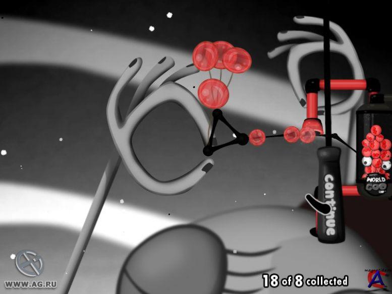 Издатель в России: Акелла Тип издания: Лицензия Таблэтка: Не требуется Язык интерфейса: Rus Официальный сайт: 2dboy.com/games.php /> Русский сайт: ru.akella.com/Game.aspx?id=2150 /> Вся информация: www.ag.ru/games/world_of_goo /> Награды: Оценка AG: 93% (превосходно) / Оценка игроков 88% (2926 голосов) Игра получила положительные отзывы и награды. Главным образом за инновационный геймплей. Также были отмечены визуальный ряд и музыка. Игра победила на Independent Games Festival (2008) в номинациях: Innovation Award Technical Excellence Игра заняла второе место в номинации «Инди года» (2008) журнала Игромания.  Маленькие каплевидные существа по имени «гууу» очень любопытны! Они всегда готовы исследовать свой удивительный мир во всех направлениях! Однако они не знают, что находятся в игре и исключительно приятны на вкус. Вы должны помочь им преодолеть все сложности и опасности, попадающиеся на пути! Малыши «гууу» с радостью создадут для вас умопомрачительные конструкции, но им нужно ваше мудрое руководство! Не бросайте этих непосед в беде!..  Очаровательное и незабываемое графическое исполнение; Большое разнообразие неповторимых и стильных уровней со своими загадками и существами; Несколько разновидностей шариков «гууу» с уникальными особенностями; Масштабное онлайновое соревнование по всему миру: исходя из результатов прохождения вы можете построить самую высокую башню на территории «Корпорации Мира Гууу»! Это еще одна увлекательная головоломка!  • Windows XP SP2 (рус.), Windows Vista (рус.), • Pentium IV 2 ГГц, • 512 Мб ОЗУ (1024 Мб для Windows Vista), • 256 Мб Directx 9-совместимая 3D видеокарта (уровня GeForce 6600 и выше, кроме встроенных видеокарт), • 300 мб свободного места на жёстком диске, • 8x CD-ROM, клавиатура, мышь, DireсtX 9.0c.