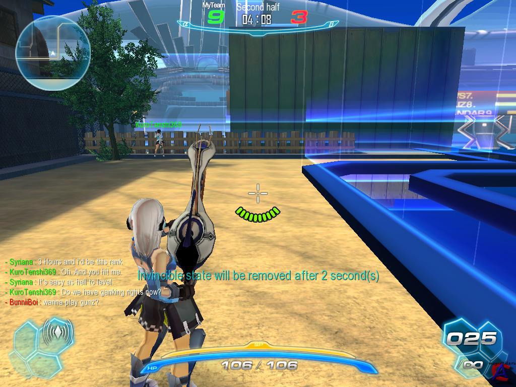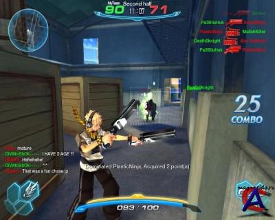Режимы игры У игроков есть 3 слота под оружие, и 1 под специальное умение. TouchDown — новый аналог всем известного режима CTF (Захват Флага), в которой две контрольные точки (или ворота) создаются по обе стороны локации. «Fumbi», в свободное от обоих команд время похожий на маленького человечка-инопланетянина, исполняет роль флага. Во время захвата принимает форму мяча над головой игроков, по умолчанию располагается по центру карты. Игрок должен захватить Fumbi и донести его до ворот врага. Fumbi также быстро истощает SP (Силу) игрока, что приводит к невозможности использования умений и ускоренного бега. Fumbi будет находиться над игроком до тех пор, пока тот не пройдет через электронные заграждения (обычно они закрывают точку появления, чтобы вражеская команда не могла ждать появления умерших игроков) или не умрет. Team Death Match (Смертельный Бой) — режим, в котором две команды, до 6 человек в каждой, борются за максимальное количество баллов (получаемых за убитых игроков команды-соперника) или до тех пор, пока не истечет время. Death match карты обильно обустроены объектами, которые можно разрушать. Например, крыши зданий и ящики, раставленные так, чтобы ни одна из команд не могла воспользоваться ими как опорой для перелома битвы. Chaser Mode - (Один против всех) - в начале каждого раунда выбирается (методом "корейского рэндома") один из всех игроков вошедших в комнату, который становится чейзером и переносится в разряд врагов. У чейзера намного повышен показатель брони, показатель SP и показатель урона (урон меняется в зависимости от количества игроков в комнате). Так же за чейзером летает "скелет", попадание по которому наносит урон чейзеру. Цель матча: для чейзера - убить всех игроков за определённое кол-во времени, задача остальных выжить. За выживание дают 15 очков, если сам умер но хоть кто-то выжил - 5, а если чейзер убил всех то 0. При этом чейзер может получать по 2 очка за каждого убитого им протвника, за отмеченного зелёной мишенью он получает 4 очка. Очки так же можно получать атакуя чейзера, за заполнение появляющегося при атаке индикатора даётся 2 очка. Sword Mode Match — тип игры, где игроки могут использовать только рукопашное оружие, такое как Plasma Sword, Storm Bat и Counter Sword. Как следует из названия, в этом режиме запрещается использование оружия классов «огнестрельное» и «техническое». Так же в нём запрещается использование всех умений, за исключением «+30 или +15 HP» и «Skill Mastery». Данный режим используется в обоих предыдущих режимах (TD и DM) и также доступен в Chaser Mode, но не является популярным у игроков. Во всех картах присутствует режим "Sword Mode". Регистрироваться на официальном сайте: s4.ru.alaplaya.net После установки игры, ей потребуется некоторое время, что бы скачать и установить новейшие патчи, готовьтесь подождать немного. Приятной игры! ;)