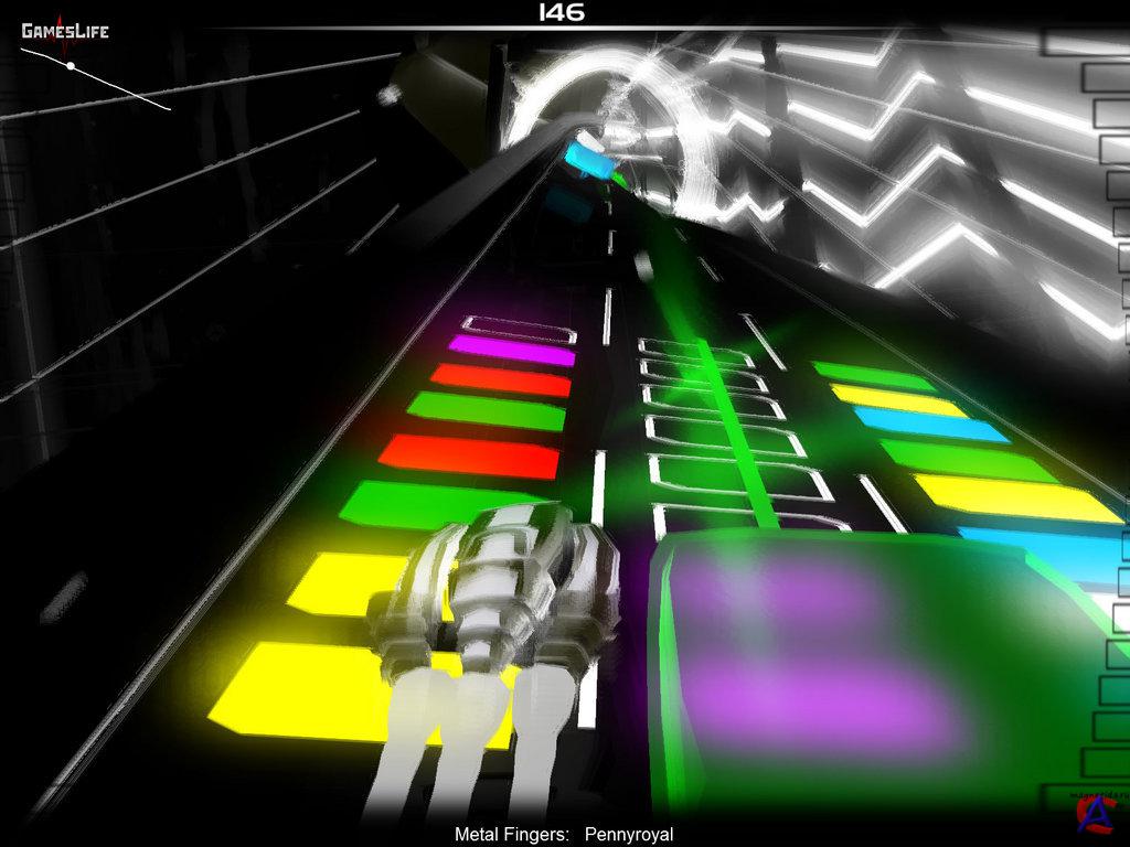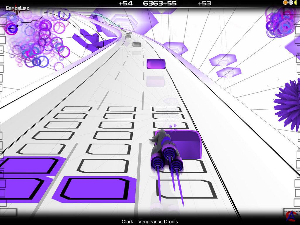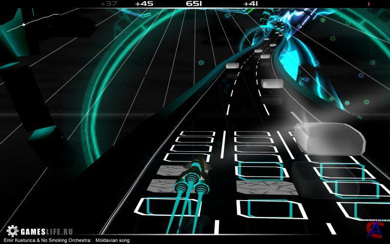 Разработчик Audiosurf, LLC Издатель Valve В России Бука Дизайнер Дилан Фиттерер Дата выпуска 15 февраля 2008 Платформа ПК (Windows) Движок Quest3D Жанр аркада Режим игры однопользовательская игра, совместное прохождение двумя игроками, сетевая таблица достижений Системные требования: Windows XP / Vista Intel Pentium 4 1.6 ГГц 512 MB ОЗУ Видеокарта с 32 Мб памяти (желательно с поддержкой PS 3.0) Звуковая карта DirectX 9 Соединение с Интернетом Управление мышь, клавиатура, геймпад Лекарство: присутствует Audiosurf (русск. Аудиосёрфинг) — аркадная музыкальная игра, с первого взгляда напоминающая гонку: у игрока в распоряжении есть космический кораблик и трасса, которую необходимо пройти, набрав как можно больше очков. Игра распространялась в качестве бесплатной бета-версии, а 15 февраля 2008 года состоялся запуск полного издания через систему Steam. Название игры является совмещением английских слов audio — звукозапись, трек и surf — скользить по волнам. Вместе эти два слова образуют фразу «Скользить по волнам музыки», что очень точно отражает игровой процесс. В марте 2008 года Audiosurf стала самой продаваемой игрой на Steam, обогнав по продажам The Orange Box, Counter-Strike и несколько сотен других игр. В отличие от гонок от игрока не требуют стараться удержаться в пределах трассы, необходимо лишь собирать блоки в ряды. Игра напоминает цветовой Тетрис с той лишь разницей, что каждый блок занимает ровно одну клетку и можно выбрать именно тот, который нужен. Каждая фигура, которую сбивает кораблик, падает в воображаемый «стакан», который находится под корабликом и плывёт с ним по карте. Спереди находится верх «стакана», а сзади, соответственно, низ. Три и более блоков одного цвета, собранных вместе и соприкасающихся сторонами, уничтожаются. Надо заметить, что для медленных песен практически нельзя собрать более трёх блоков: времени на сбор оказывается меньше, чем расстояние до ближайшей фигуры. В «стакане» имеется всего 7 клеток в каждом столбце. При заполнении всего столбца, он начинает трястись, и если сбить восьмой блок, то произойдёт переполнение. В данном случае столбец обнулится, будет отобрана 1/10 часть игровых очков, а на среднем и высоком уровне сложности кораблик некоторое время не сможет сбивать блоки. Цвет появляющихся фигур зависит от музыки. Если музыка спокойна, на дороге появляются фиолетовые и синие блоки, которые приносят достаточно мало очков. Если темп ускоряется, то цвета блоков нагреваются, вплоть до редких, но дорогих красных. Кроме стандартных цветных блоков на карте попадаются чёрные (или белые, если выбрана соответствующая цветовая схема). Они не собираются в ряды, но если такой блок дойдёт до дна «стакана», он уничтожится, принося сразу 2000 очков. Помимо блоков на трассе иногда можно найти и бонусы. Они не плывут в общих рядах и могут быть, где угодно. Бонусы могут увеличить количество очков в несколько раз, сбросить в «стакан» несколько блоков одного цвета или перекрасить его содержимое в один цвет. В зависимости от режима игры на карте могут быть блоки как разных цветов, так и одного цвета. В последнем случае появляются серые фигуры, которые нельзя уничтожить, собрав в ряд; они сами распадутся через некоторое время, но будут занимать место в «стакане». Кроме того, в ряде видов игры у кораблика появляются способности, вроде перемешивания «стакана» или перепрыгивания блоков. Способност