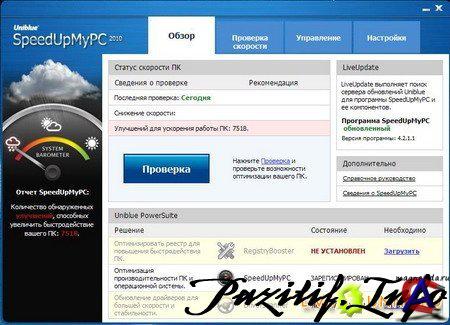 SpeedUpMyPC - программа для ускорения работы компьютера. По заявлению разработчиков увеличивает скорость даже на самых мощных машинах. SpeedUpMyPC автоматически определяет наилучшие инсталляции для вашего компьютера и управляет системными ресурсами, обеспечивая лучшую производительность. При помощи SpeedUpMyPC вы сможете творить очистку системы, следить за использованием ресурсов и ускорять быстродействие. SpeedUpMyPC дарит способность контролировать и управлять всеми ресурсами компьютера одним простым щелчком мыши. Системные настройки, интернет использование, беспорядок на диске, оперативная память и центральный процессор, все будет автоматически просканировано, очищено и оптимизировано для достижения максимальной производительности. Вы можете также остановить или удалить фоновые и процессы автозагрузки, произвести качественную дефрагментацию диска и многопроходной зачисткой, для соблюдения приватности, целиком удалить чувствительные данные и многое другое.