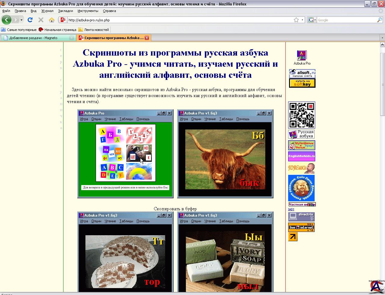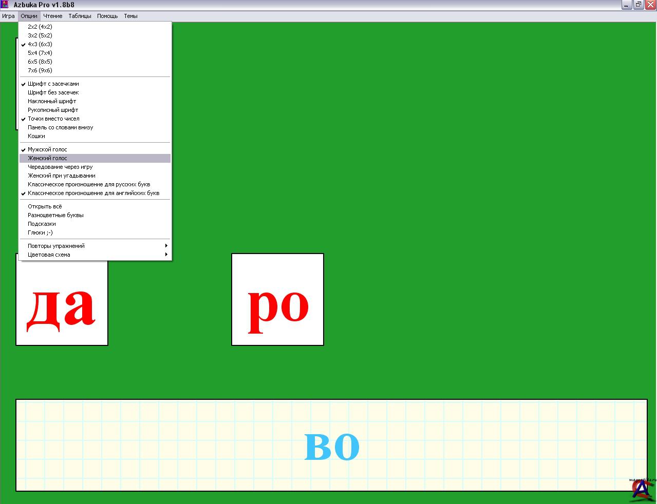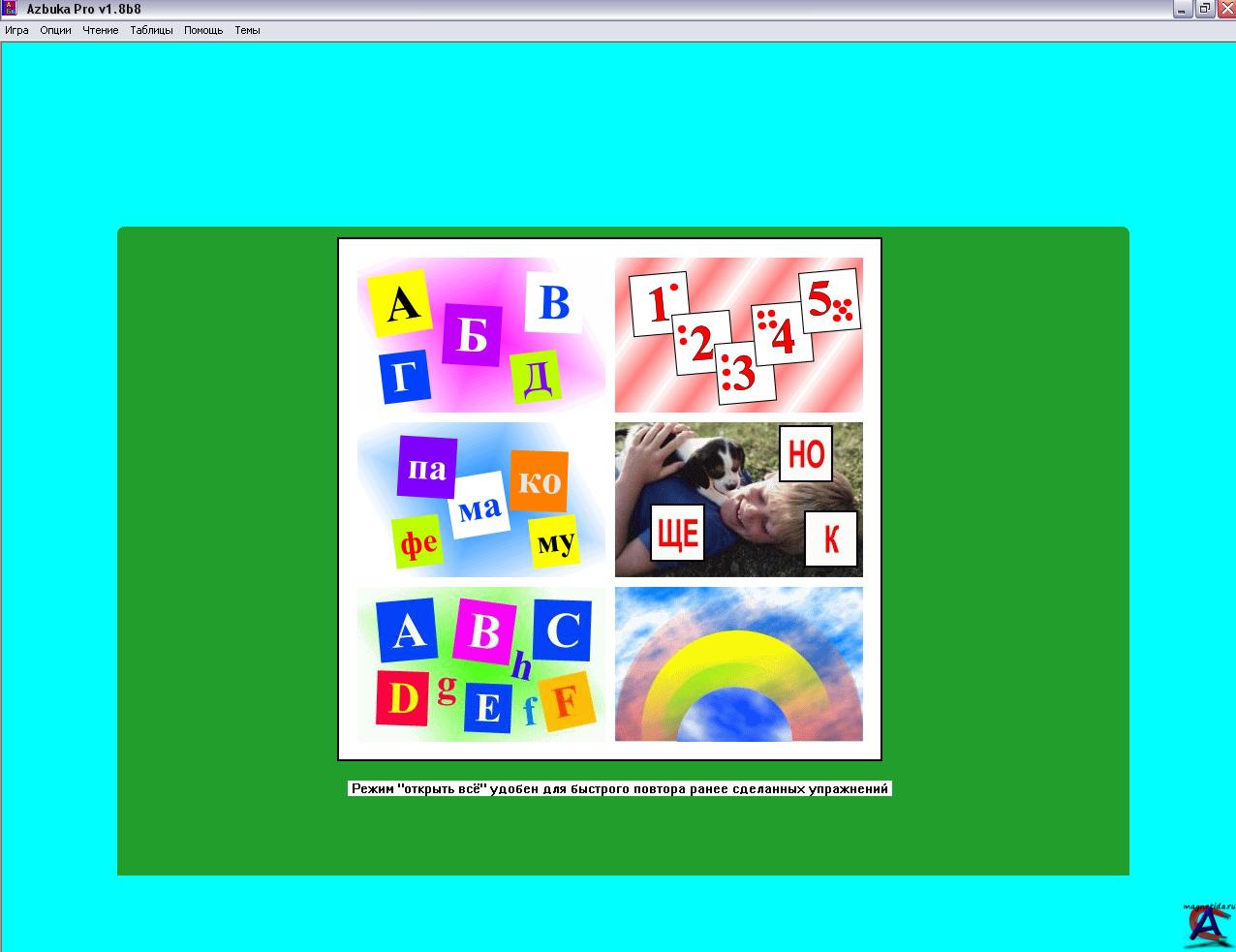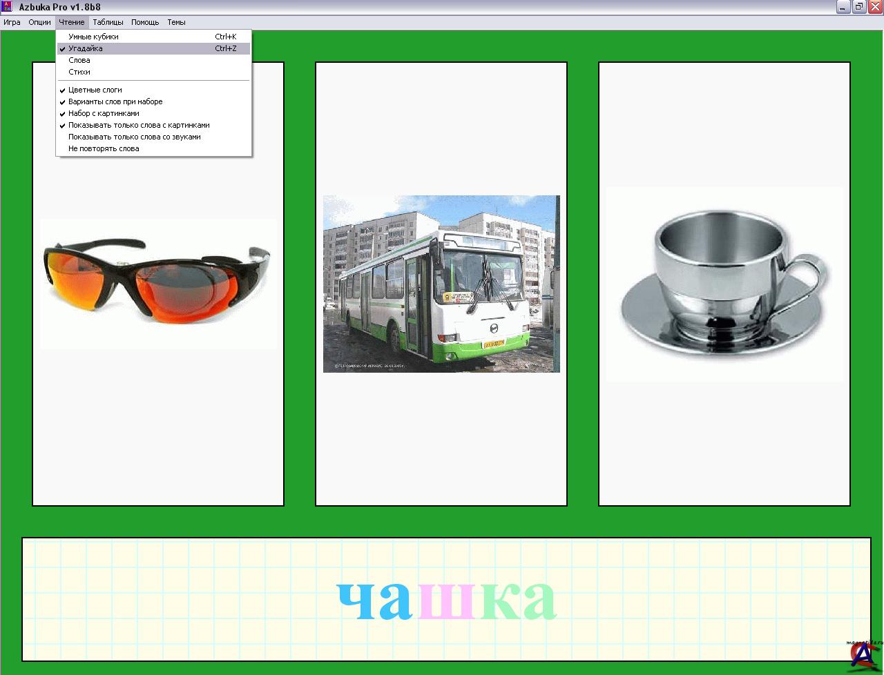 Программа говорящая русская азбука Azbuka Pro - высокоэффективный тренажёр для обучения детей от 3 до 7 лет чтению. Обучение происходит в игровой форме, начиная с самых основ: изучаем русский алфавит, слоги, составляем слова из слогов и букв и наконец учимся читать, узнаём цвета, цифры и предметы на фотографиях. + Английский алфавит и сочитание букв английского алфавита.