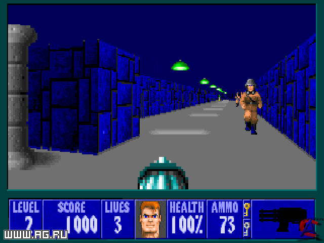 Wolfenstein 3D (1992) Open GL Описание: Wolfenstein 3D — компьютерная игра, которая сделала популярным жанр «шутер от первого лица» на PC. В ней игрок управляет солдатом, пытающимся бежать из одноимённой нацистской крепости; ему противостоит множество вооружённых охранников и сторожевых собак. Здание наполнено потайными комнатами, где хранятся разного рода драгоценности, пищевые продукты и медицинские аптечки, а также различное оружие и боеприпасы. Игра модифицирована для 3D видеокарт и работает под Windows XP и Vista. И еще Вас ждут пять игр-дополнений: Spear of Destiny; Return to Danger; Ultimate Challenge; Nazi PANIC!; Return of Hitler. Системные требования: 1. CPU 400 MHz, 2. 256 Mb RAM, 3. 32 Mb Video 3D