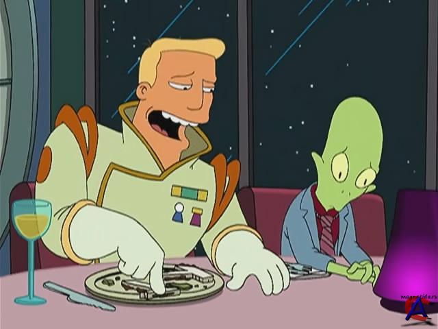 Список серий: 01. (45) «Roswell That Ends Well» (Россвел, что Хорошо Кончается) 02. (46) «A Tale of Two Santas» (История о Двух Сантах) 03. (47) «Anthology of Interest II» (Антология Интересов II) 04. (48) «Love and Rocket» (Любовь и Ракета) 05. (49) «Leela"s Homeworld» (Родной Мир Лилы) 06. (50) «Where the Buggalo Roam» (Где Скитаются Буггало) 07. (51) «A Pharaoh to Remember» (Незабываемый Фараон) 08. (52) «Godfellas» (Равные Богу) 09. (53) «Future Stock» (Акционеры Будущего) 10. (54) «A Leela of Her Own» (Лила, Как Она Есть) 11. (55) «The 30% Iron Chef» (Повар, на 30 % из Железа) 12. (56) «Where No Fan Has Gone Before» (Где Не Ступала Нога Фаната") Информация о фильме: Сериал начинается с того, что разносчик пиццы из Нью-Йорка Филип Джей Фрай случайно, как это кажется на первый взгляд, был заморожен в криогенной камере ровно в 00 часов 00 минут 00 секунд 1 января 2000 года. Он был разморожен тысячу лет спустя, 31 декабря 2999 года, и обнаружил себя в городе будущего Нью-Нью-Йорке. Знакомясь со своей будущей коллегой Турангой Лилой, Фрай пытается избежать принудительного назначения на работу курьером и внедрения ему карьерного чипа-микросхемы, что заканчивается его устройством на работу в небольшую компанию его пра-пра-пра-…-пра-внучатого племянника Хьюберта Фарнсворта «Межпланетный экспресс», занимающуюся межгалактическими грузоперевозками, на должность курьера. Сериал показывает приключения Фрая, Лилы, робота Бендера и многих других персонажей, связанные как с полётами в космос, так и с личностями героев.